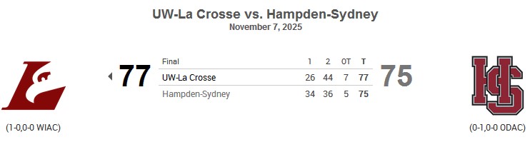 UW-La Crosse-None ; Hampden-Sydney-1 ( Tugg Bizzelle) .